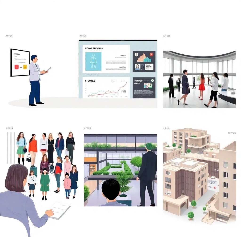 Команда архитекторов подалась на международный конкурс. Конкурентов — десятки, все с хорошими идеями. Их фишка была не только в концепции, но и в том, как они её показали: живые визуализации квартала, дневной и ночной вид, люди в кадре, «возраст» проекта — как он будет развиваться по годам.